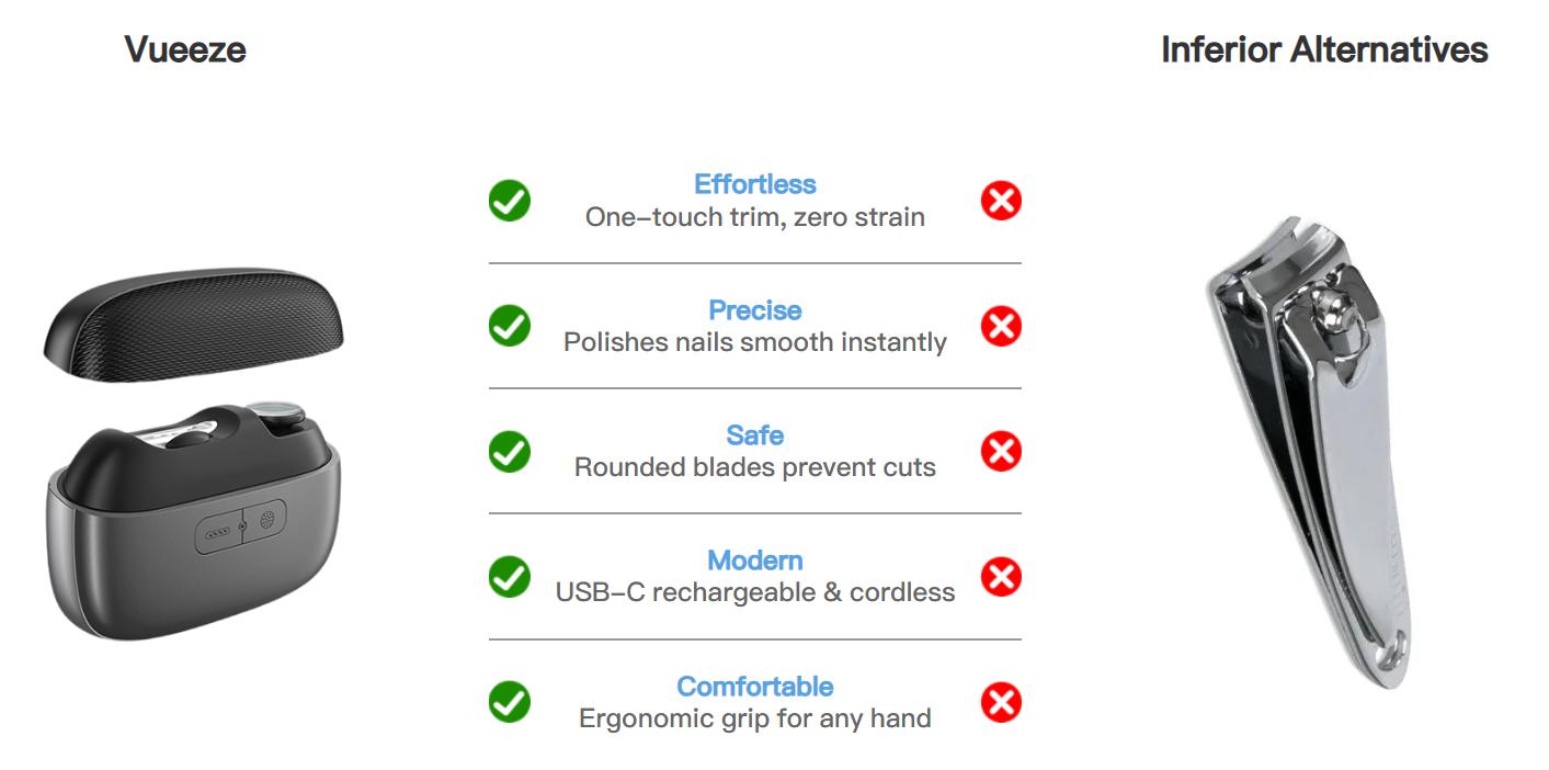 Engineered with podiatrist-inspired precision, Vueeze EasyClip powers through thick, curved, or hardened nails in seconds—no force required.